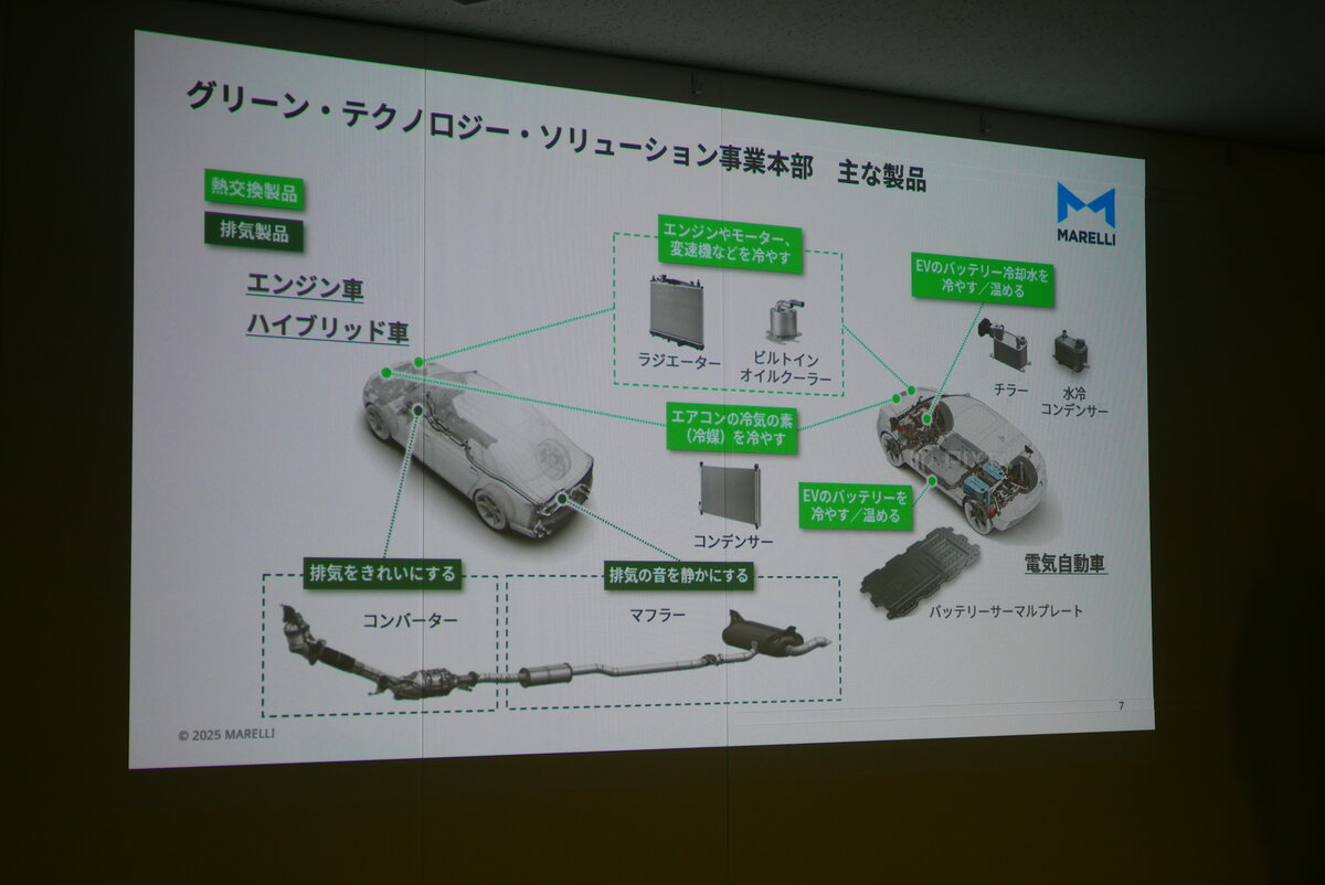 具体的に扱うのは、マフラーなどの排気製品と、ラジエターなどの熱交換製品だ。従来からあるエンジン車やハイブリッド車向けには、触媒を含むコンバーター、マフラー、エアコン用コンデンサー、エンジン用ラジエター、トランスミッション用ビルトインオイルクーラー(BOC)などの製品がある。バッテリーEV向けには、バッテリーを冷やすためのバッテリーサーマルプレートや水冷コンデンサー、チラー、モーターを冷やすビルトインオイルクーラー(BOC)を提供する。