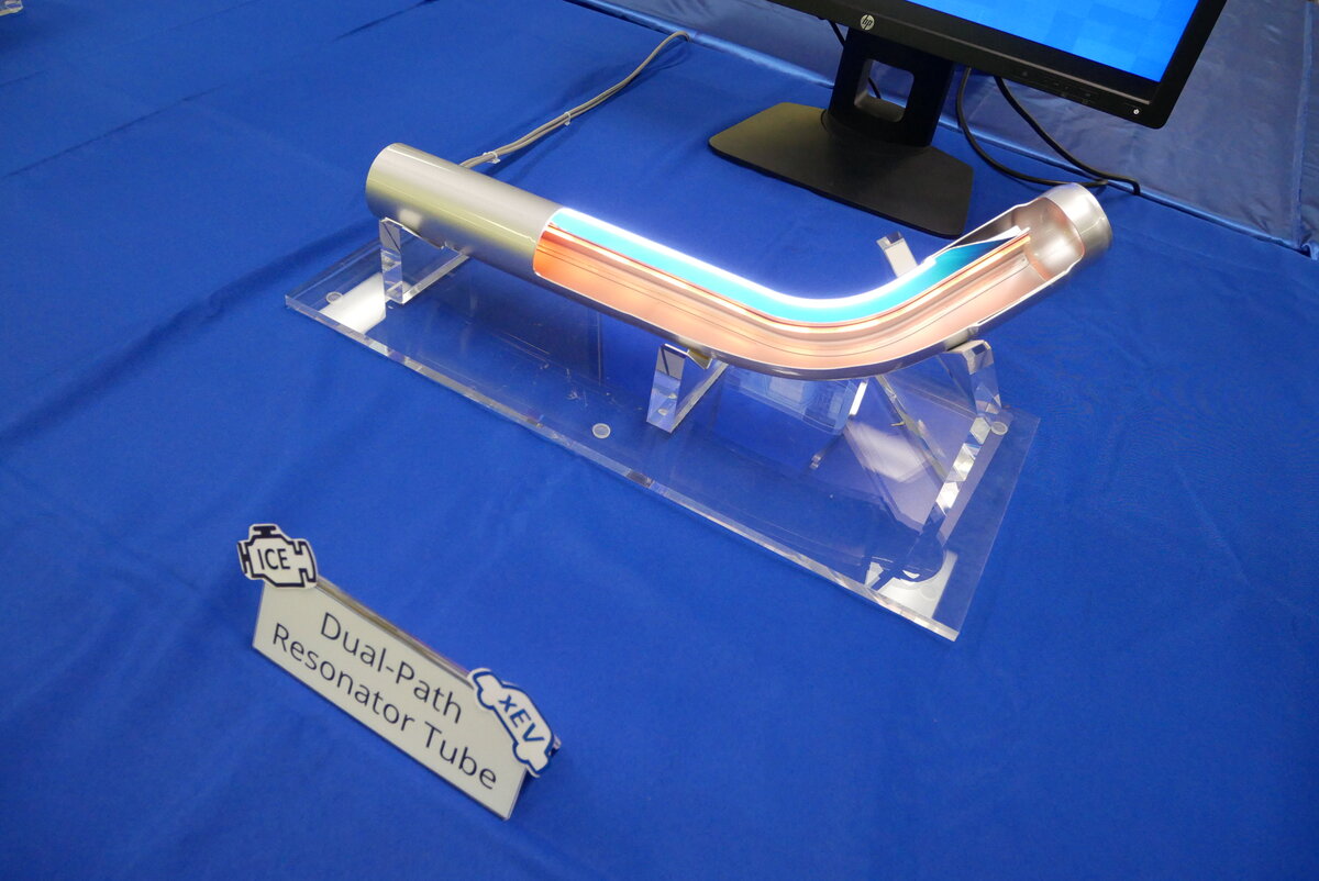そのシステムは、コンバーター/GPF、センターマフラー、メインマフラー、排気システム素材までが含まれる。触媒を含むGPF一体型コンパクト二重管コンバーターは、より早く温まり、より長時間温かいままを保つ。その特性は、モーター走行の多いハイブリッド車に向いているという。シータレゾネーターは、床下に大型バッテリーを搭載するPHEV向けの技術だ。排気管の中を二重化して、その一方を共鳴室にする。消音機能を保ったまま、より小さくすることができ、バッテリーのためにスペースを提供するという。グラスウールレスのマフラーは、微細孔を通るときに音の振動エネルギーが熱に変換されることを利用する。グラスウールなしでも消音機能を実現するため、より軽量で、より廃棄が楽になるという。
